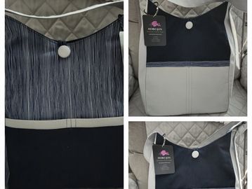 This Hobo Bag is made of a Combination of Navy , Gray and Navy Stripe. Its reversible with 8 sectioned pockets total. Of course Hand washable and self button closure!