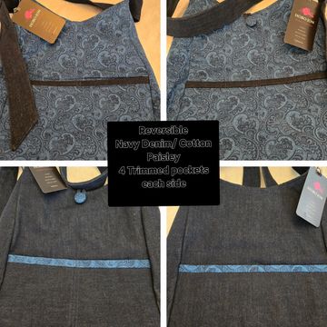 This navy denim bag reverses to a beautiful blue paisley cotton . Hand washable with 8 pockets and button closure.